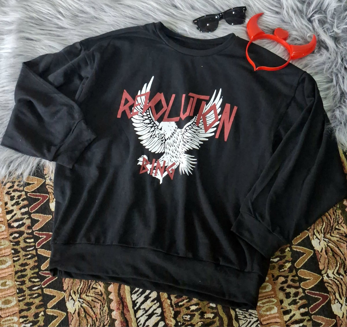 Buzo Over rústico, estampado, amplio, mangs simil ranglan . Medidas 70 cm de largo, 60 cm de ancho, 49m, 49 cm largo de brazo.