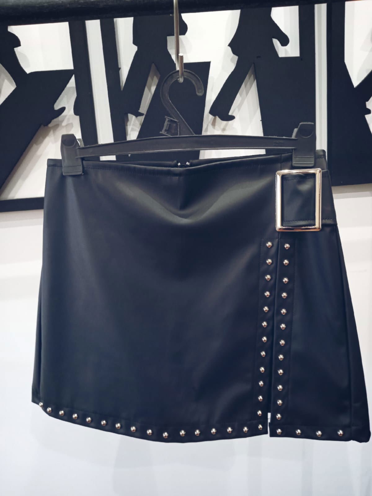 Falda engomada, con detalles de tachas y hebilla de cinto.