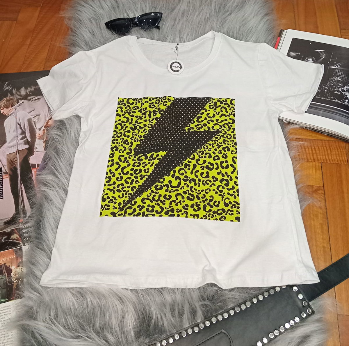 Remera Clásica estampada de algodón, detalle de strass. Medidas: 60 cm de largo, 46 cm de ancho. 19 cm de sisa.