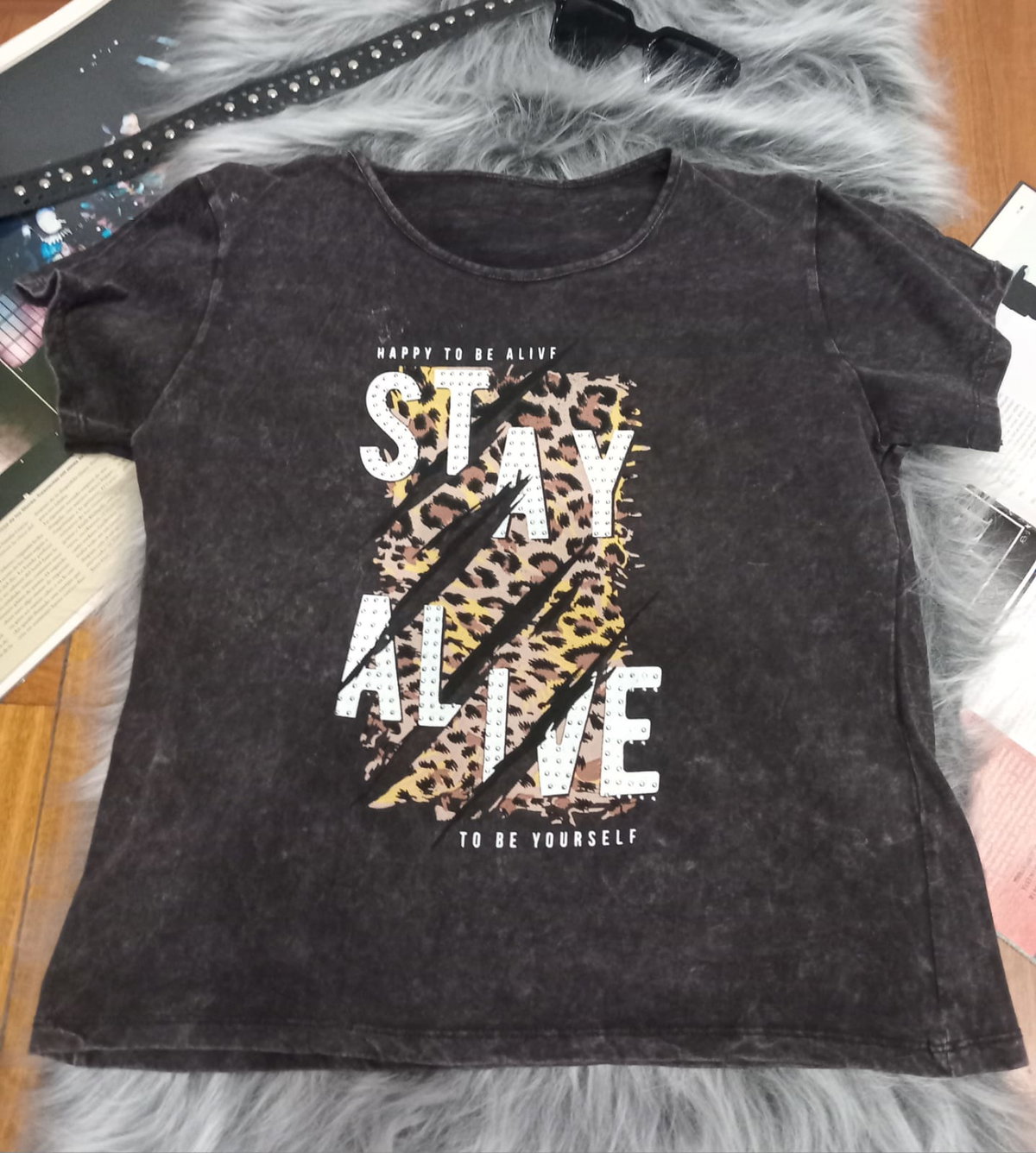 Remera nevada de algodón, estampada. Ccon detalle strass. Talle único. Medidas, 58 cm de largo49 cm de ancho, 20 cm de sisa.