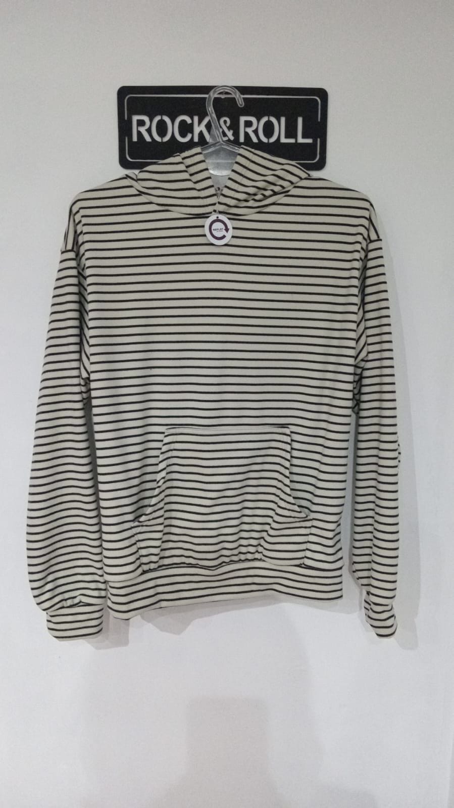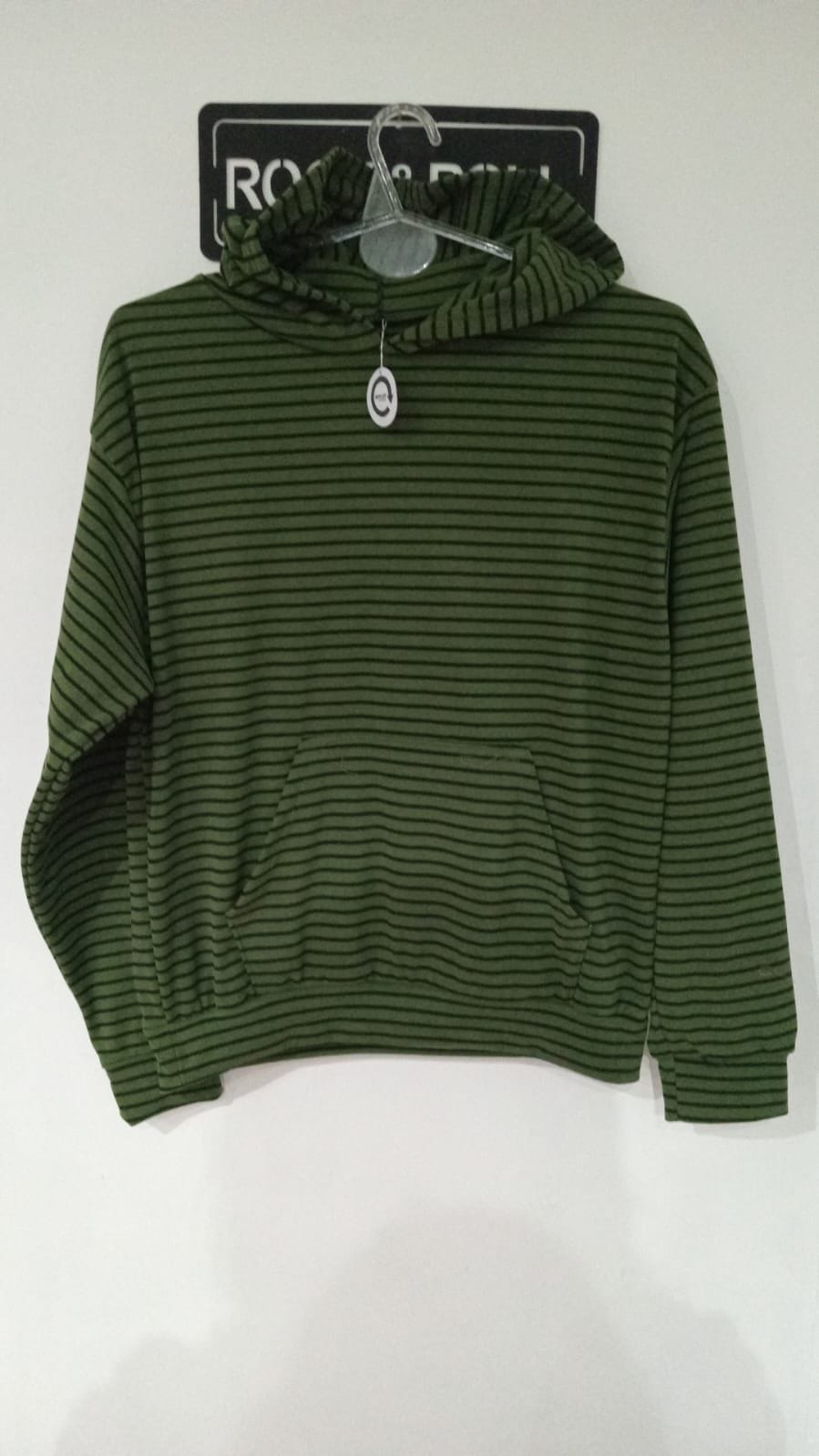 Buzo rayado, tela darlon, canguro. Medidas, 61 cm de largo,52 cm de ancho, 24 cm de sisa.