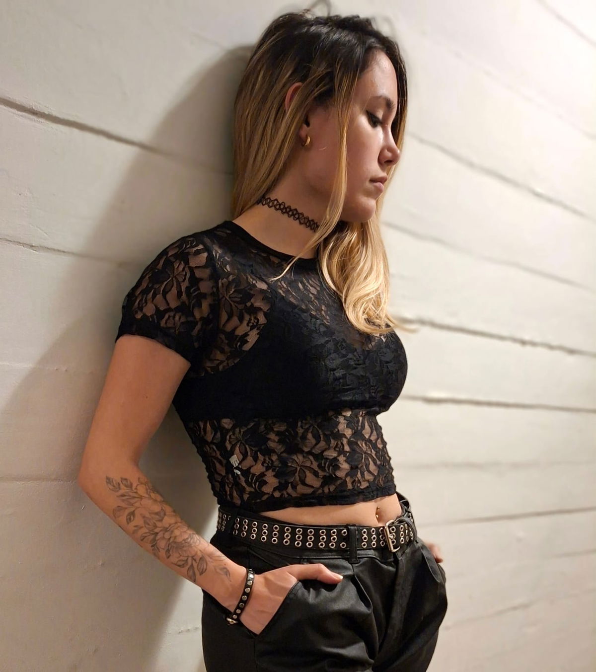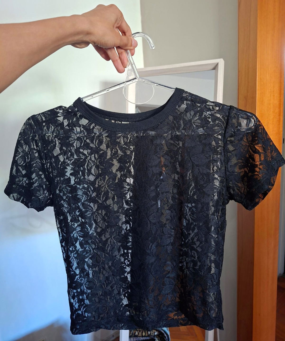 Top de encaje, talle M. Medidas: 47 cm de largo, 41 cm de ancho, 19 cm de sisa.