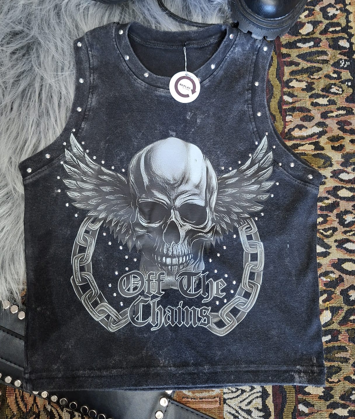 Top corte americano,  detalle de tachitas.  Talle único. Medidas: 45 cm de largo, 38 cm de ancho, 19 cm de sisa.