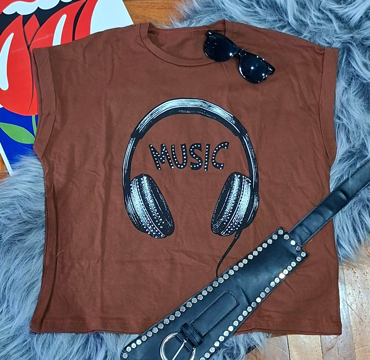 Remera clásica de algodón estampada, manga dobladillo. Talle único. Medidas 60 cm de largo, 54 cm de ancho, 21 cm de sisa.